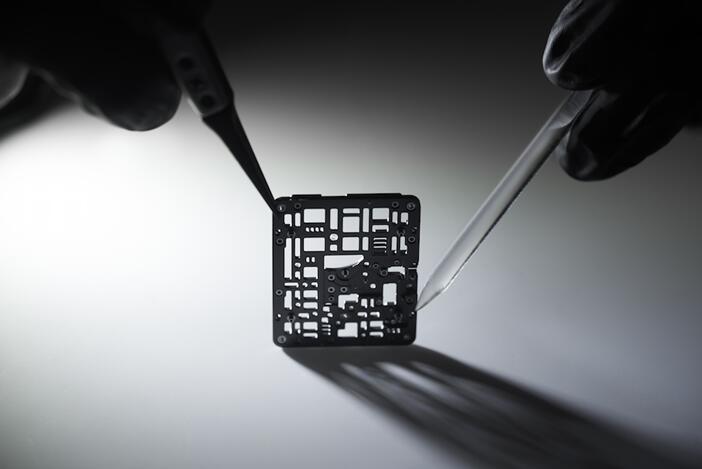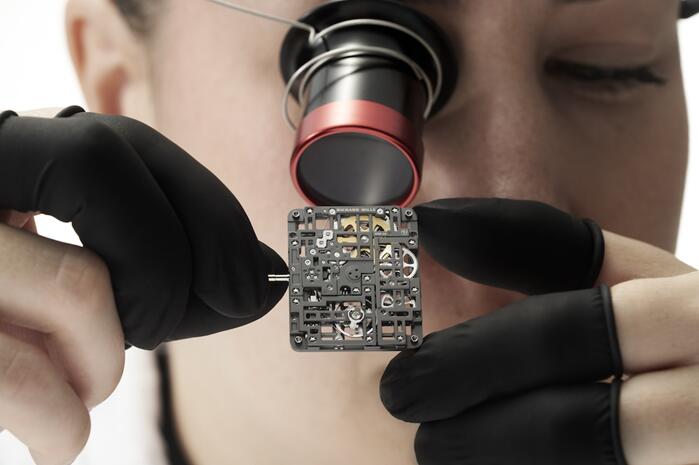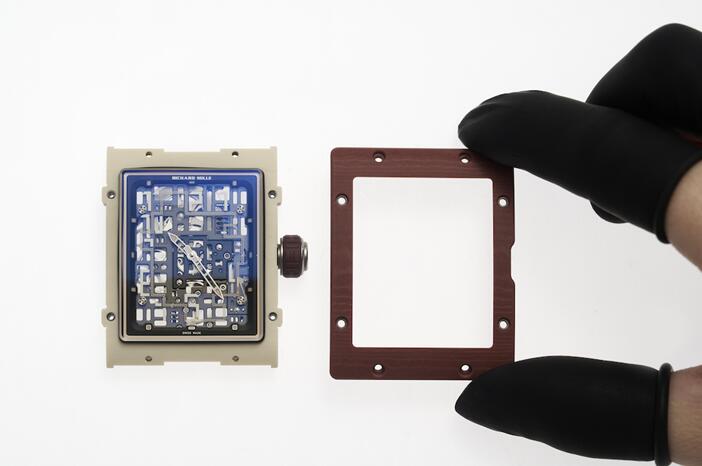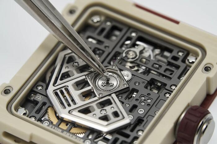 内部搭载理查米尔全新自制CRMA9自动机芯,矩形机芯与超薄表壳相适应,融入建筑理念的底板和桥板,采用五级钛合金打造,并以灰色镀层处理,轻盈、坚固、富于层次感。