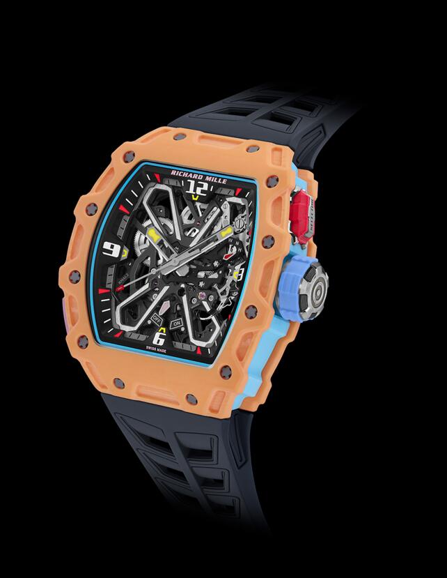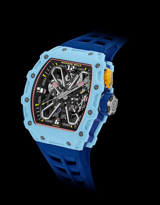 在Quartz TPT石英纤维加工过程中,还可以通过染色工艺呈现出不同的色彩。继白色与蓝色之后,今年理查米尔为RM 35-03腕表增添了浅蓝与三文鱼两款新配色,鲜艳、活泼,更为年轻运动。