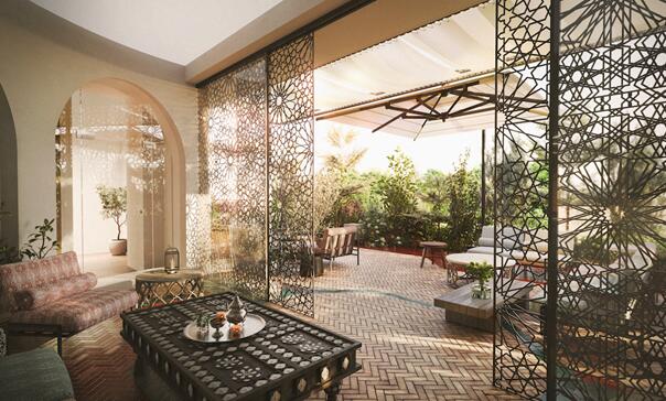 小门与甬道长廊借鉴了北非建筑格局,可以减缓户外炎炎烈日加热房间的速度,让“居住”更舒适。而庭院与室内之间的镂空窗花屏风,在室内外投下斑斑点点,无意间与阿布扎比卢浮宫巧妙关联。