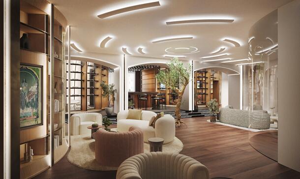 宽阔的中央大厅连接数个不同功能区域,有餐厅、酒吧、运动酒吧、庭院、隐藏式“图书馆”等,每一个空间都特色鲜明、风格独具。