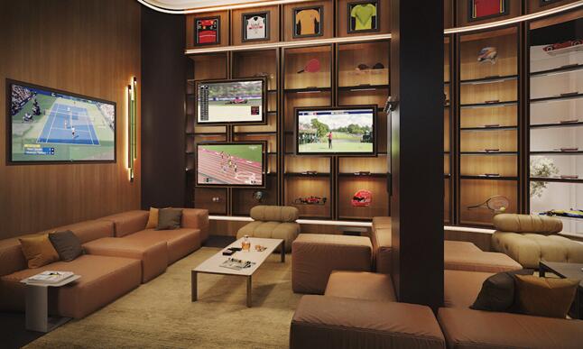 在运动酒吧,你可以看到不同屏幕里播放着与理查米尔密切相关的体育赛事;而橱柜的不同格子里,陈列着品牌挚友使用过的头盔、球拍、网球、高尔夫球等运动相关物品。