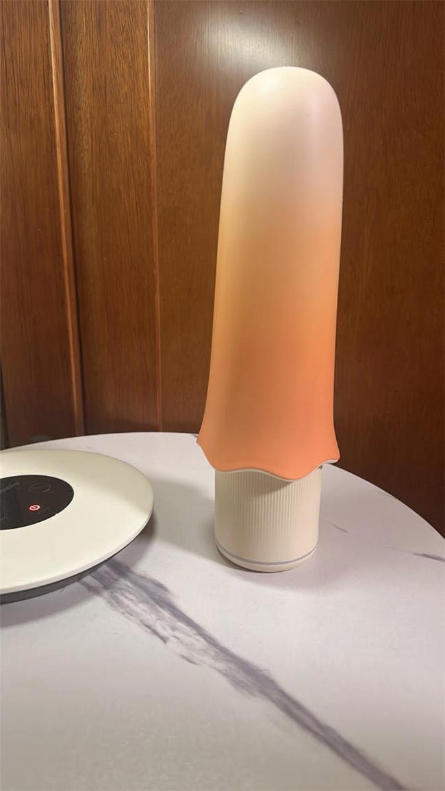 外罩+底座+机身,然后入体的棒棒的部分,整体造型像一颗修长饱满的蘑菇,颜色是超级治愈的落日橘与淡白粉渐变,握在手里非常有安全感。