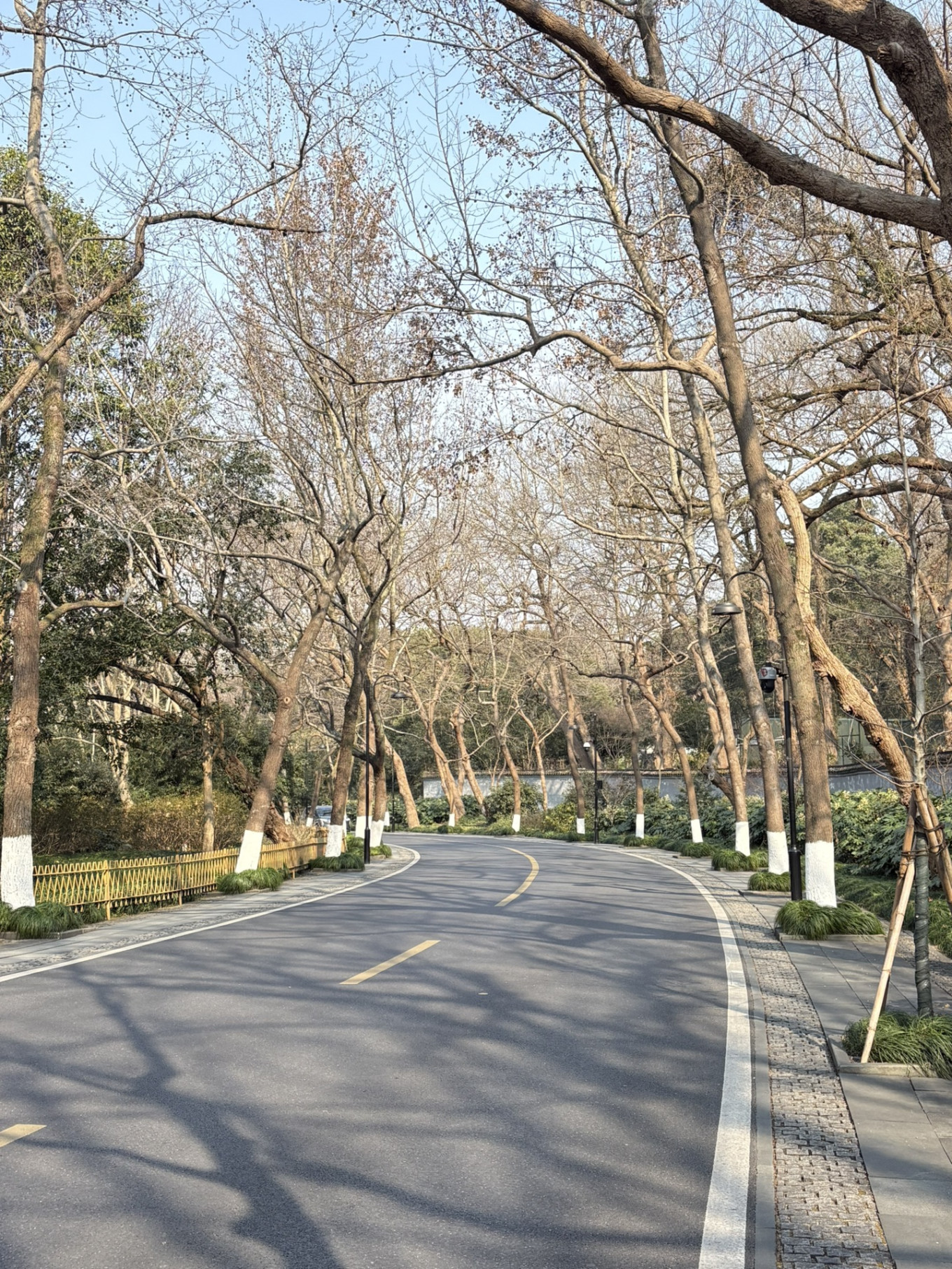 这里还有一个溪流,建议大家春天的时候来杭州看一看,肯定特别好看。杭州这边的路都特别好看,不愧是经济大省哈哈,有钱啊。之后去了杨公堤,冬天虽然很冷,大多数树木都没有绿意了,但是我们看到了水杉,很漂亮。
